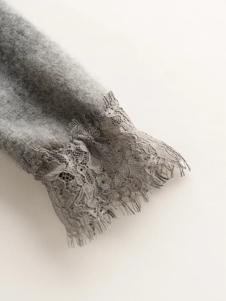 Tricoté dans un cachemire luxueux et enveloppant, il se distingue par ses finitions délicates en dentelle, apportant une touche de féminité sophistiquée.